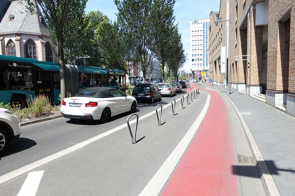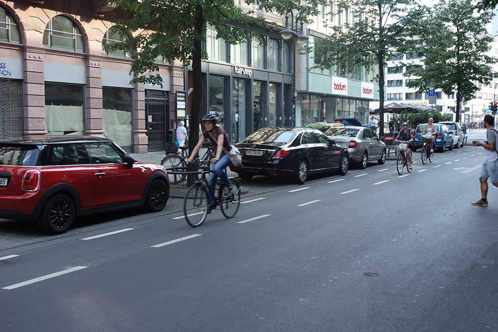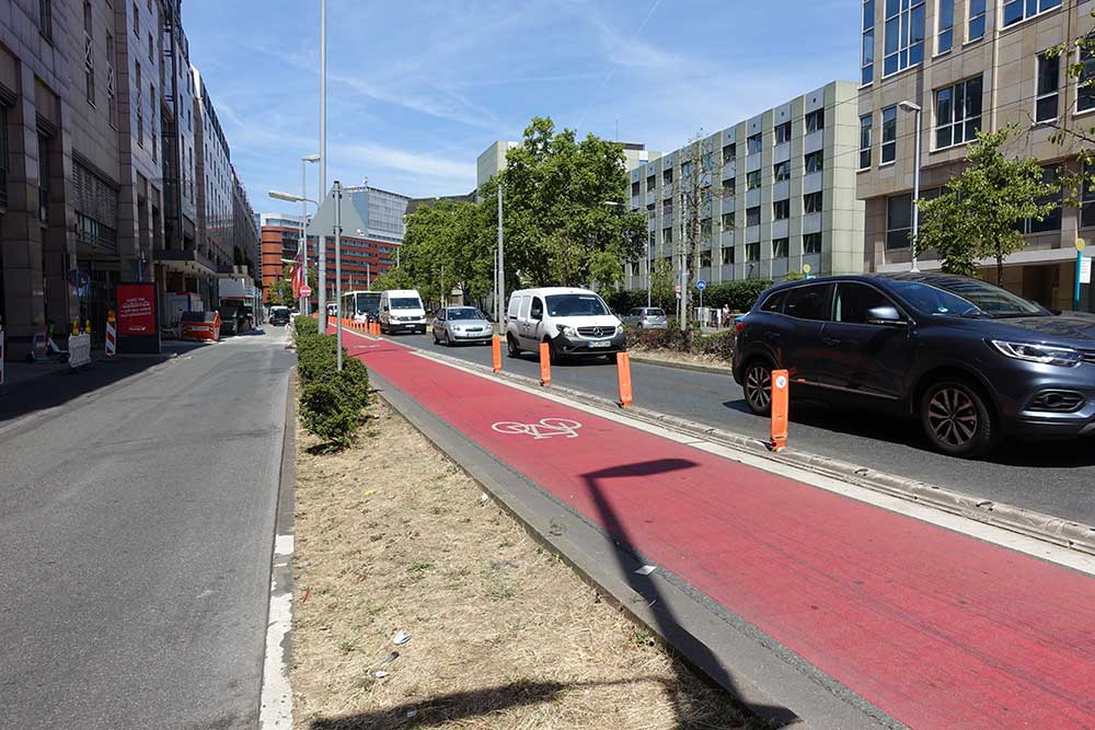 フランクフルトでは、白線と色分けだけで区切られた自転車レーンが多いのですが、この写真のように車道とブロックなどで物理的に分離されたタイプも徐々に増えつつあります。
