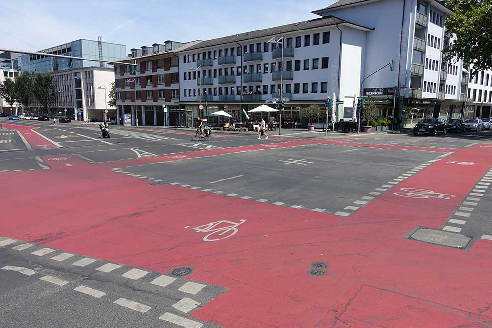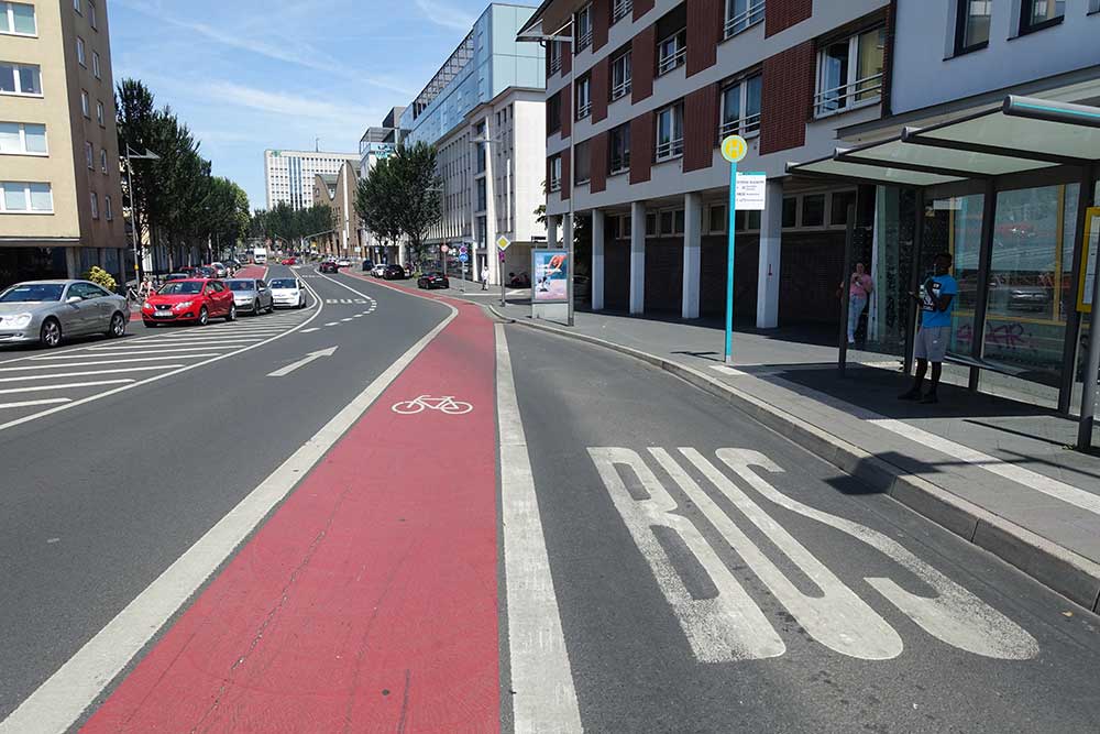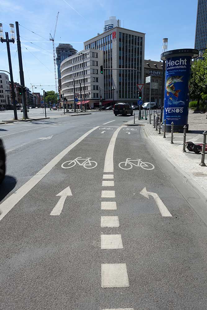 右折レーン(ドイツでは右側通行のため、日本の左折にあたる)がある場合、直進自転車は自動車の直進レーンと右折レーンの間を走行します。この形はドイツ各地でよく見られます。