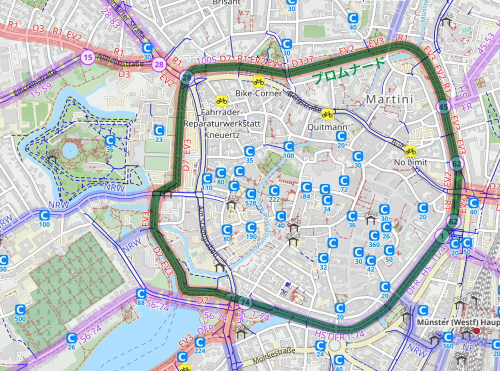 下の地図で緑の線で示されている部分が「プロムナード」で、もとは旧市街を囲む城壁と堀があった場所です。