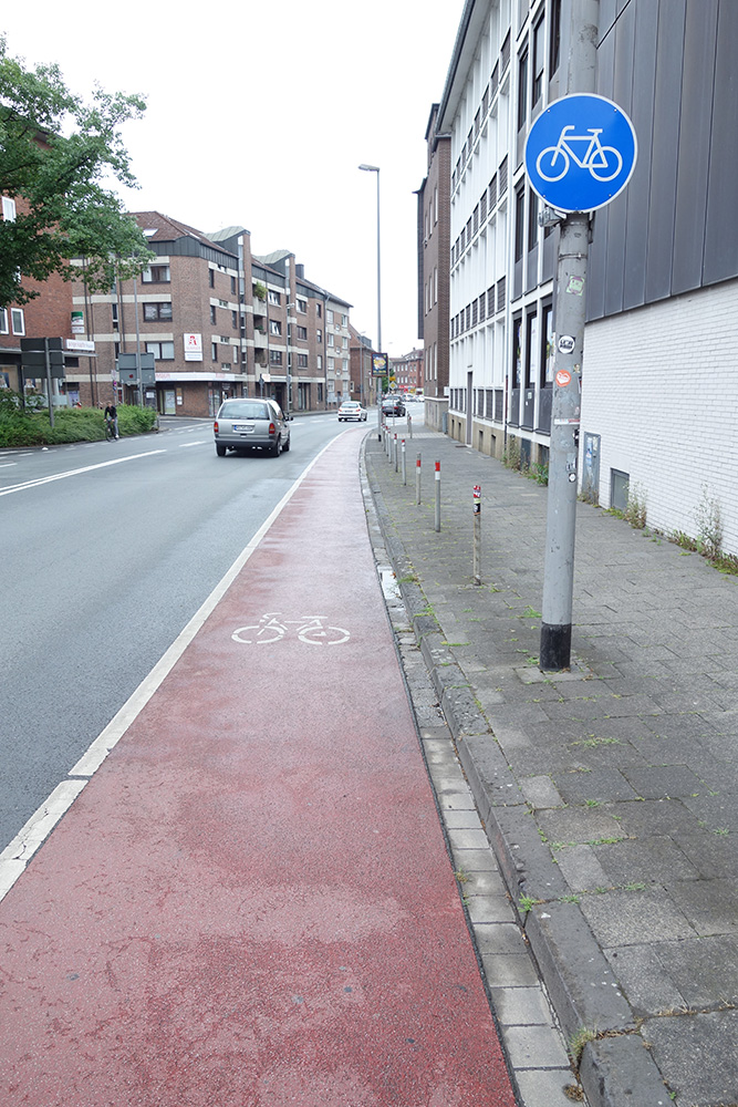 ただし、日本の歩道上の自転車通行帯とは異なり、ドイツでは街中の自転車道は原則として片側通行です。道路の右側のみを走行し、交差点の手前では車道側へ寄る構造になっていることが多いです。