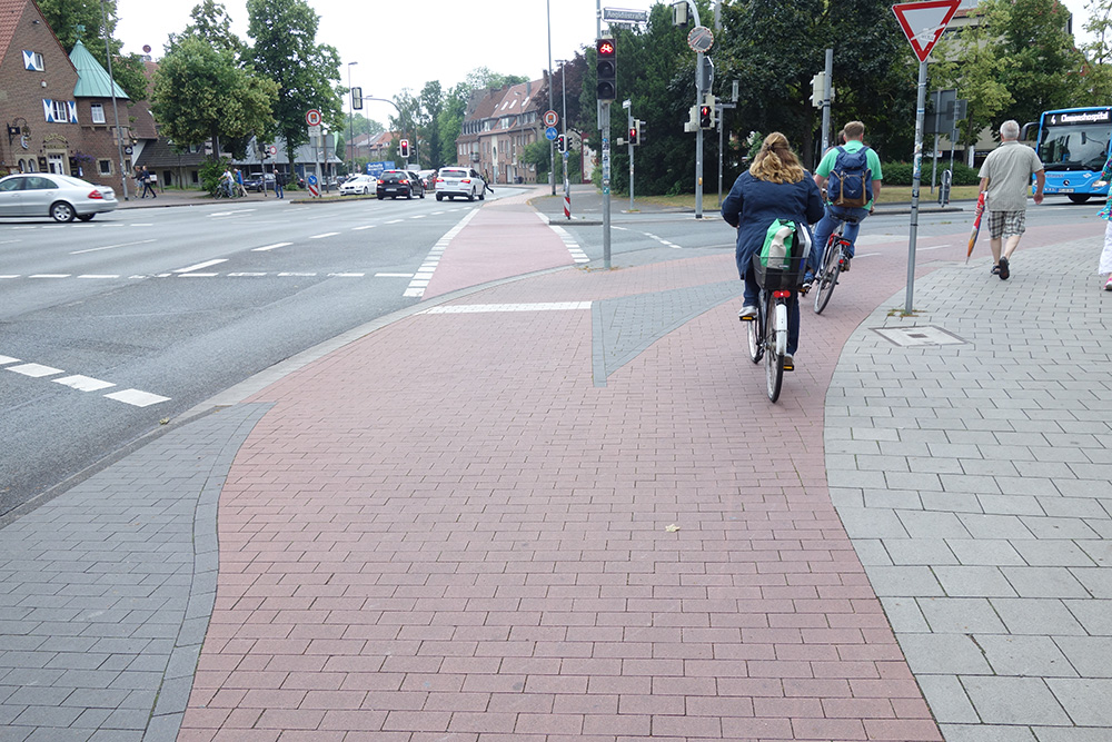 次の写真は、歩道を色分けした自転車道です。ミュンスターでも、およそ半数の自転車道はこのように歩道を分けて作られています。