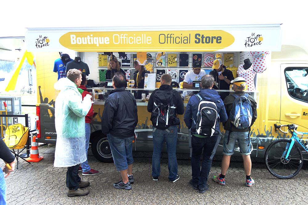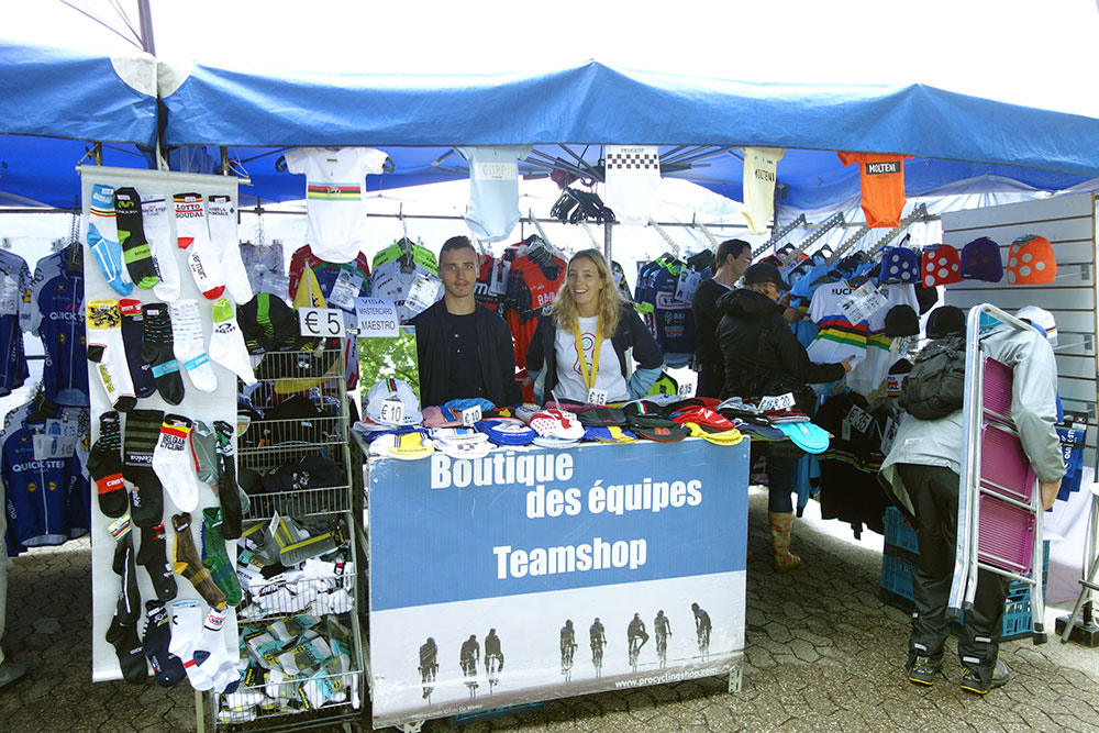 その周辺には、公式グッズショップやスポンサー企業のブースが数多く立ち並び、出場チームのサイクルジャージなどを販売していました。