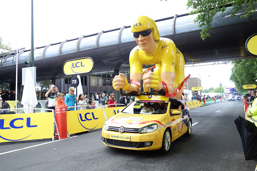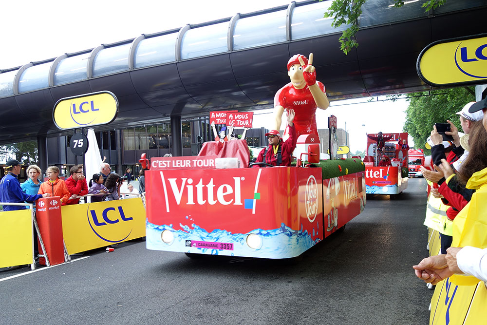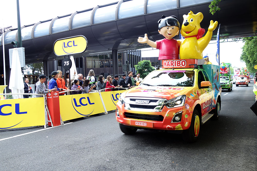 レースが始まる前には、「キャラバン」と呼ばれるスポンサー企業の装飾車両が次々と登場し、観客を楽しませていました。