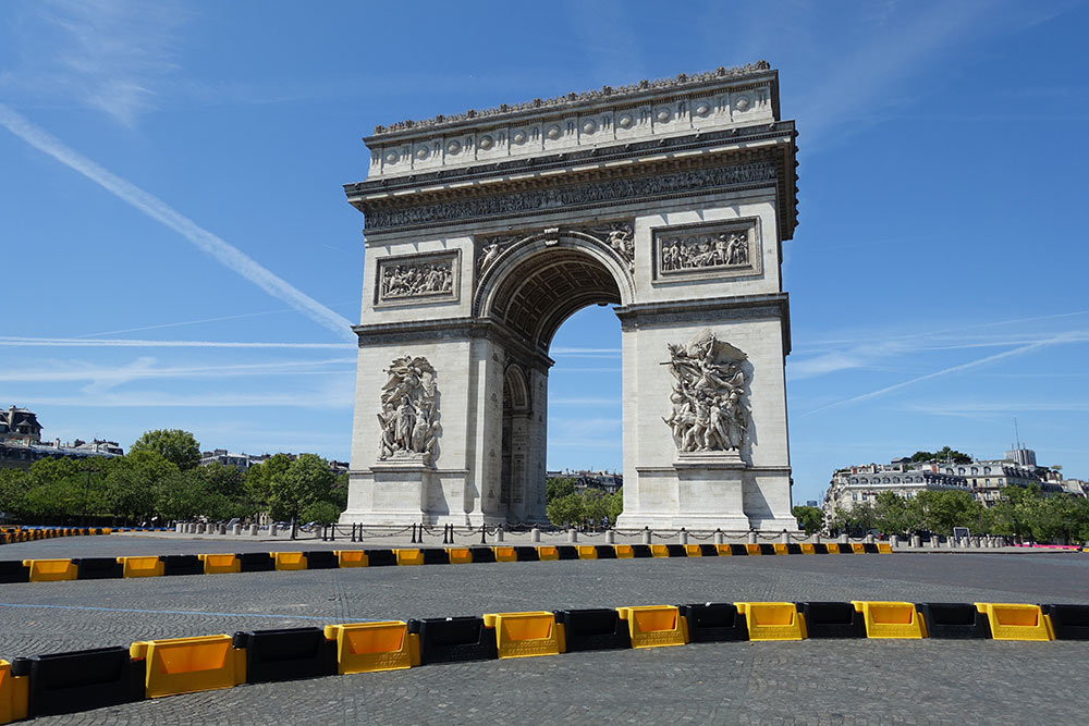 レースに備えて、凱旋門周辺の道路はすべて交通規制が行われ、人も車も入れない状態になっていました。普段は観光客で溢れる場所が、自転車レースのために完全に封鎖される様子は、ツールならではの特別な雰囲気です。