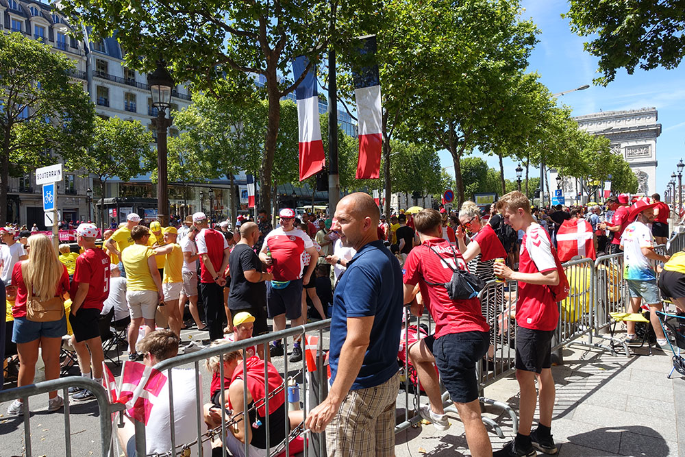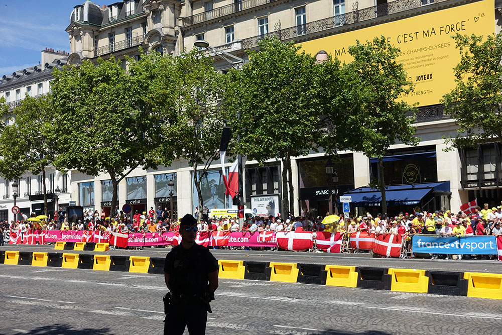 この年は、デンマークでのグランデパール(開幕)に加え、デンマーク出身のヨナス・ヴィンゲゴー選手が総合優勝候補(そして実際に優勝)ということもあり、沿道には大勢のデンマークからの応援団が集まっていました。赤地に白い十字のデンマーク国旗が、シャンゼリゼ沿いの観客席のあちこちではためいていました。周辺は何万人もの観客で埋まり、スタート前から熱気に包まれていました。