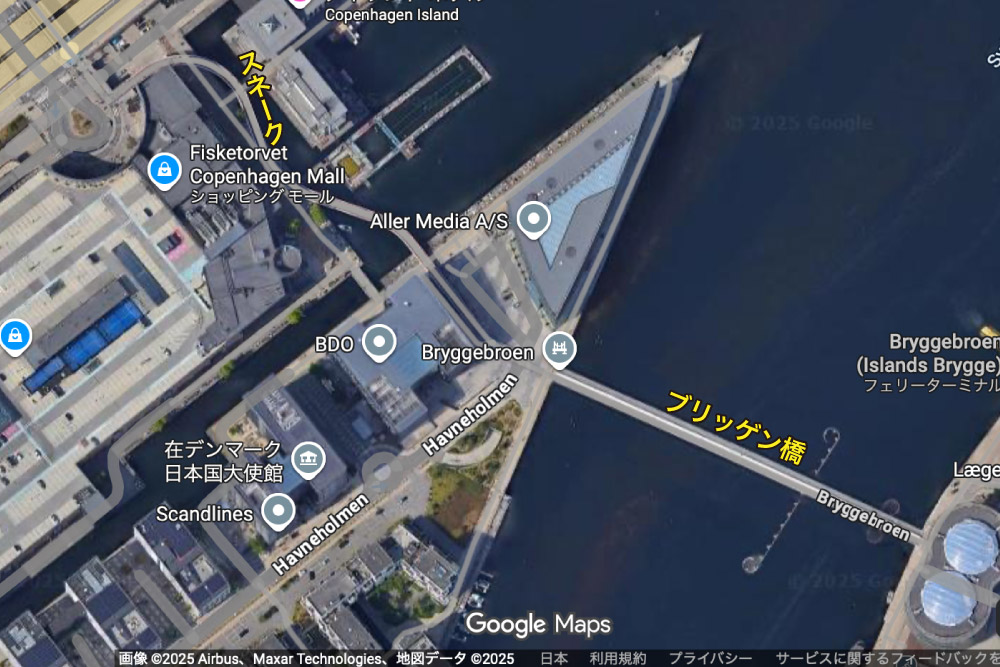 近年、その水路をまたぐ自転車用の橋が次々と建設されています。中でも最も有名なのが、「スネーク」と呼ばれる自転車専用橋です。コペンハーゲン中心部近くのショッピングモール入口付近から始まり、水路の中にある小さな島に一旦降り、そこからさらにブリッゲン橋を経由してアマー島へとつながっています。