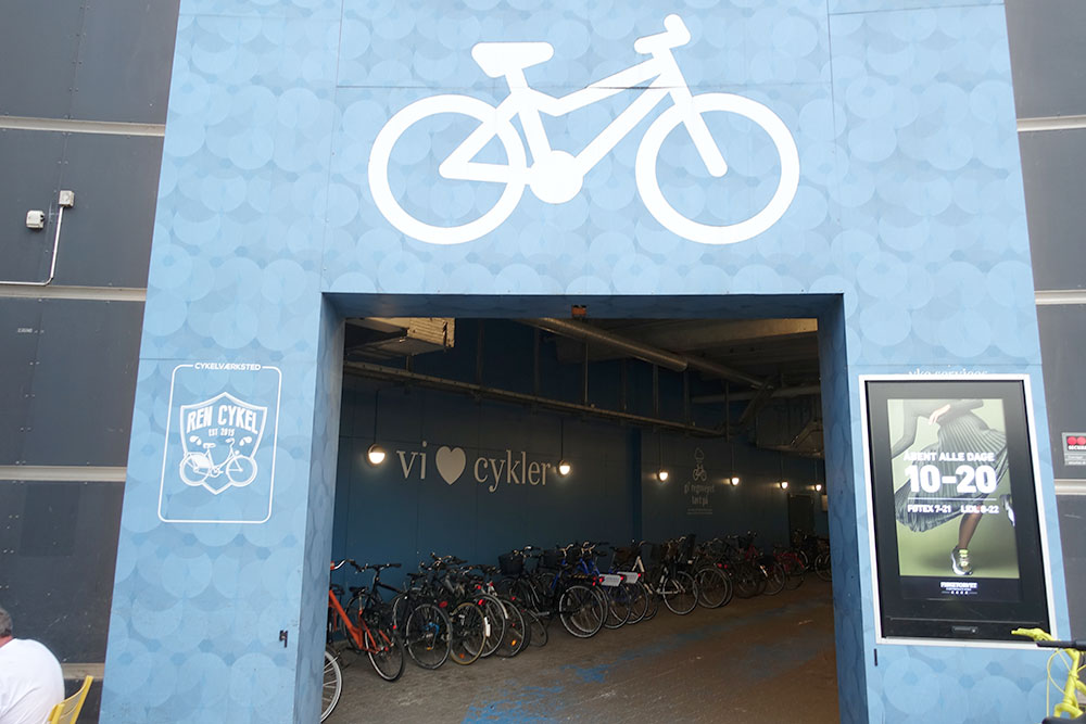 橋のたもとにあるショッピングモールの駐輪場入口には、「vi ♥ cykler(私たちは自転車が好きだ)」と書かれていました。コペンハーゲンは、このように街の至るところで自転車が歓迎され、推奨されていることを実感できる街です。