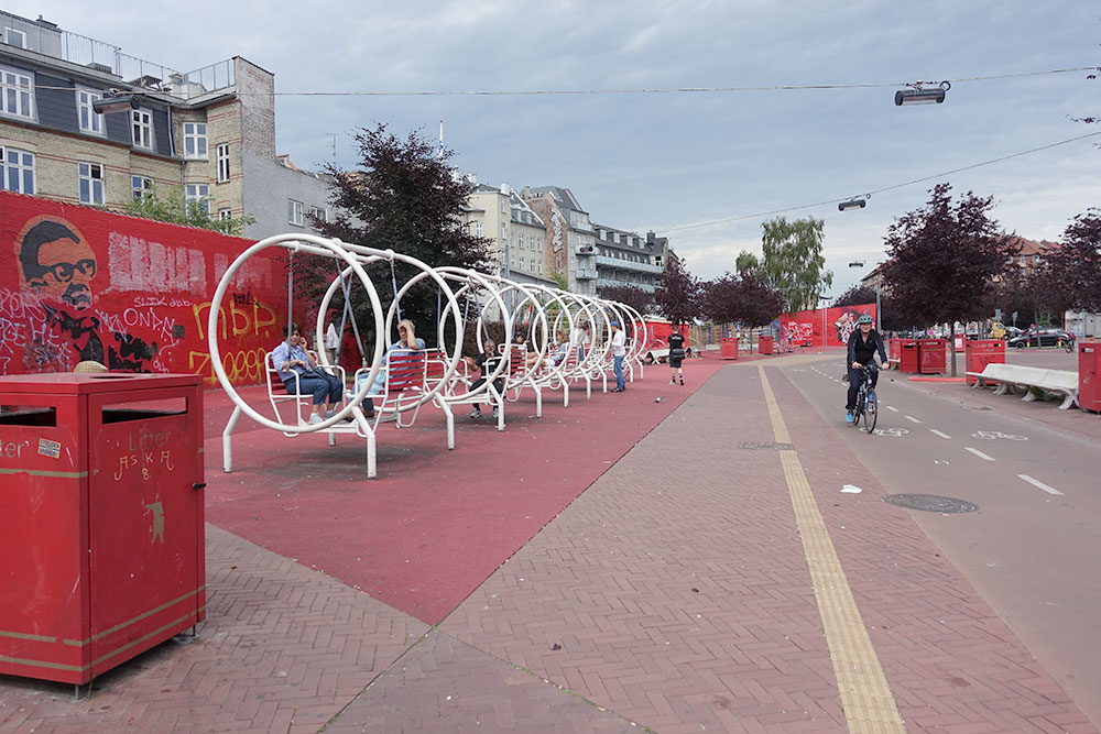 サイクルラックや塀が真っ赤に塗られていて、日本人の感覚では普通考えられないデザインです。