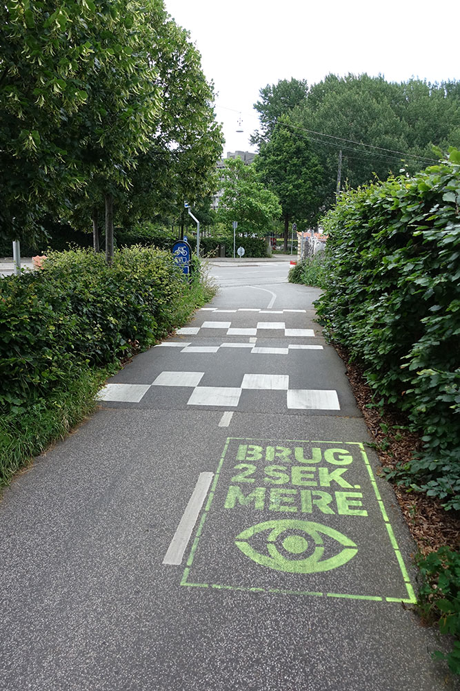 交差点の手前には、注意喚起の路面標示と、自転車のスピードを落とさせるためのハンプが設けられています。