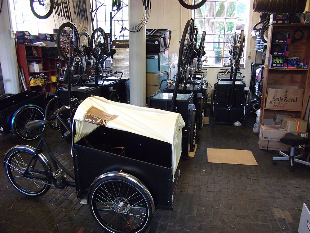 次の写真がクリスチャニアバイクで、右側のものには雨よけの幌が付いています。