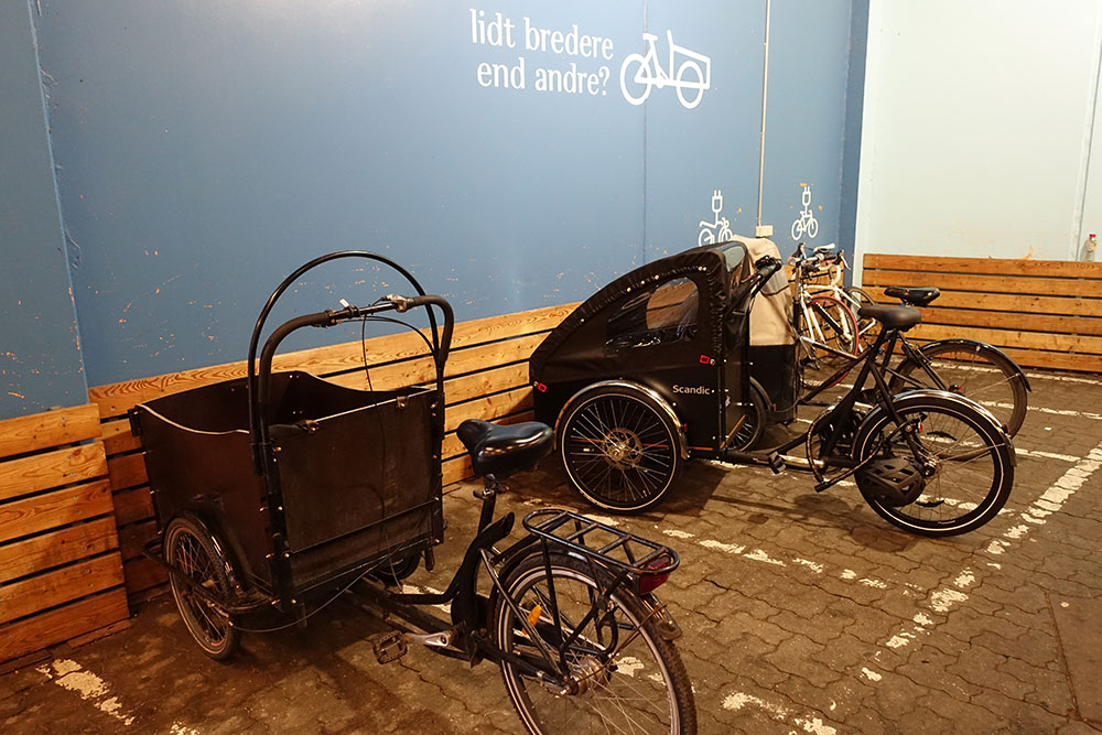 市内にある自転車専用橋「スネーク」のたもとにあるショッピングセンターの駐輪場で撮影したものです。カーゴバイク用の駐輪スペースが設けられています。