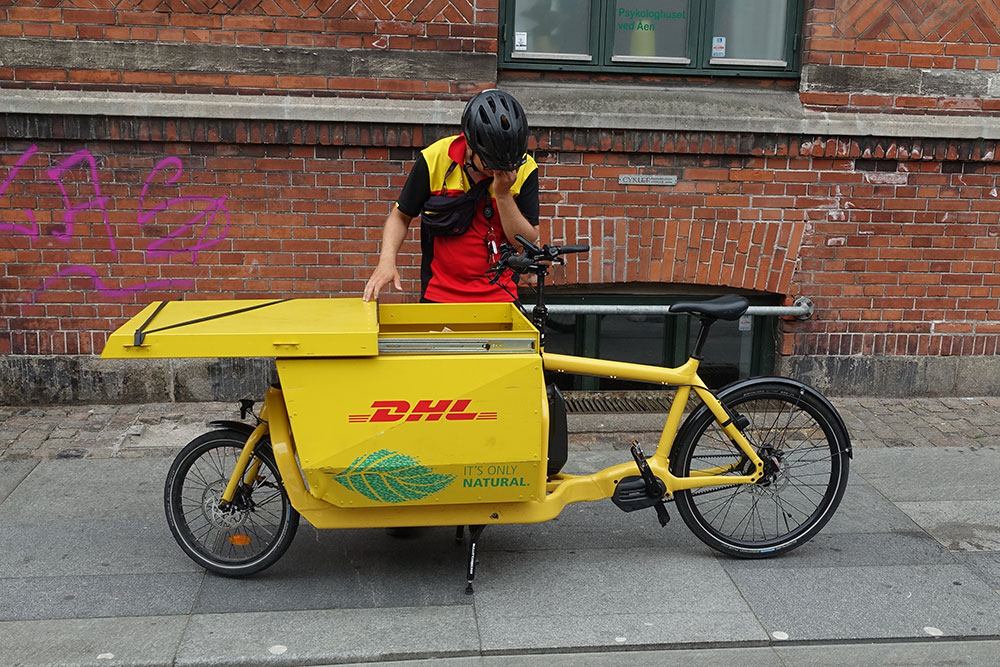 国際宅急便のDHLも、カーゴバイクで配達を行っていました。こちらも洗練されたデザインです。