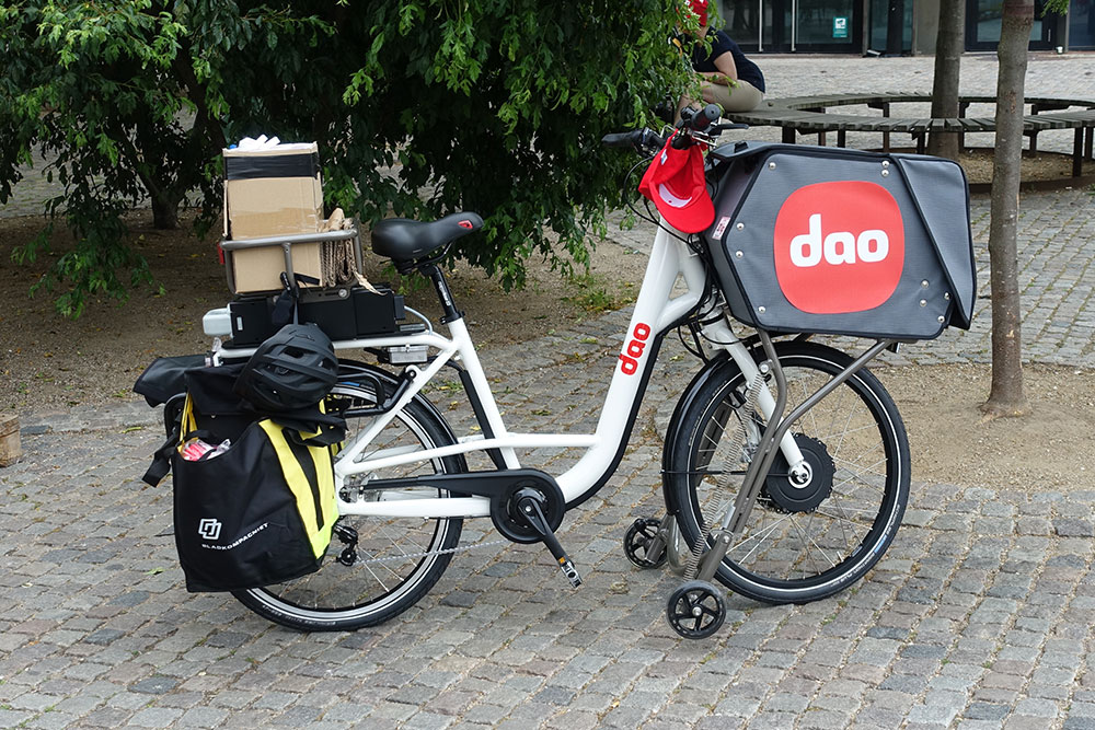 daoは、手紙や小包を扱う配送会社です。カーゴバイクとは言えないかもしれませんが、自転車で配達していました。大きなフロントバッグに車輪が付いたスタンドが装備されているが面白いです。
