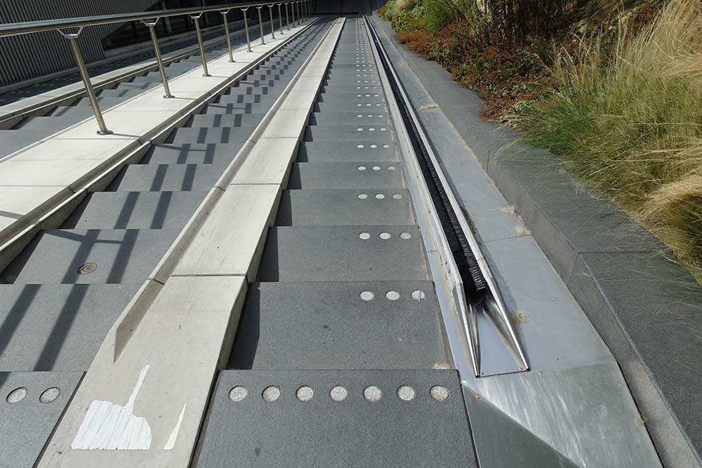 階段の横には、自転車を押して下りするためのレールが設けられており、リムの汚れを落とせるブラシも付いています。