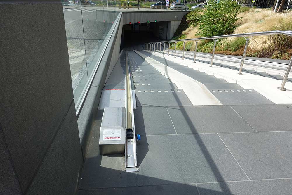 さらに、上り用の階段のレールにはベルトコンベアが設置されており、自転車を置くと自動的に動く仕組みになっています。