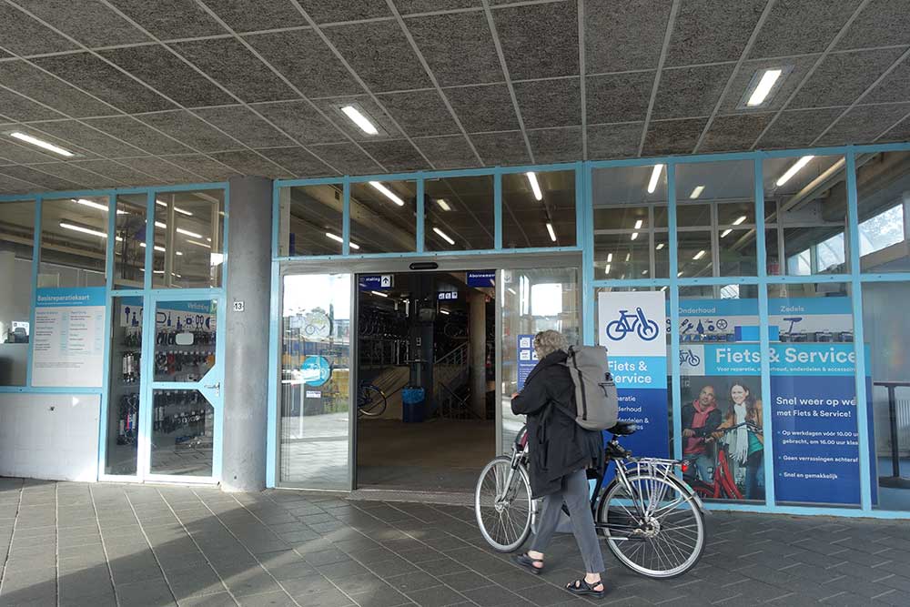 こちらは、ズウォレ駅前の地下駐輪場の入り口で、左側に見えるのが駅舎です。