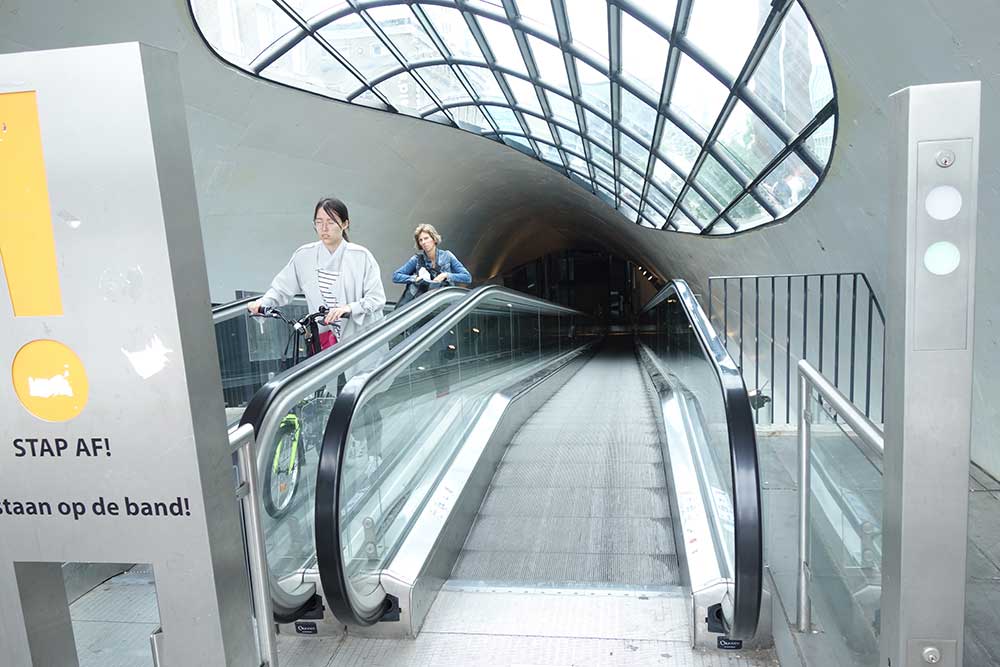 斬新なデザインで、スロープ状になったエスカレーターを使い、自転車といっしょに上り下りできるようになっています。
