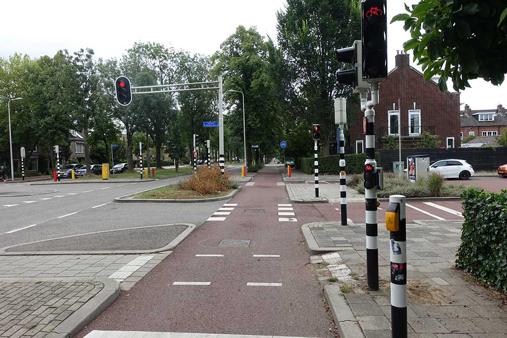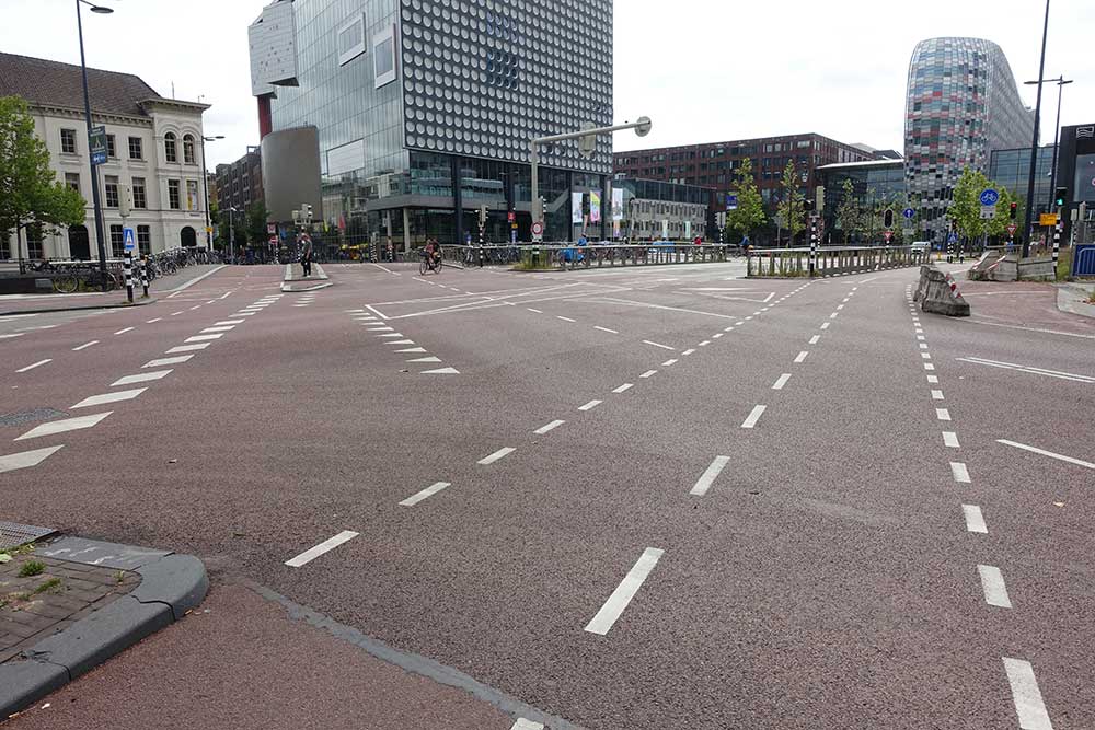 まずは、フレーデンブルク交差点です。写真の右上に見える建物は、ユトレヒト中央駅前のショッピングセンターです。ここはユトレヒトで最も交通量の多い交差点で、平日には1日平均32,000人もの人が自転車で通過するといわれています。自転車用の信号が設けられているのはもちろんのこと、自転車の走行位置も複雑に指定されています。現在、自転車道の幅は5mですが、北側の歩道の利用者が少ないことから、その分を拡張して7mにする計画があるそうです。