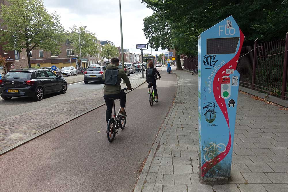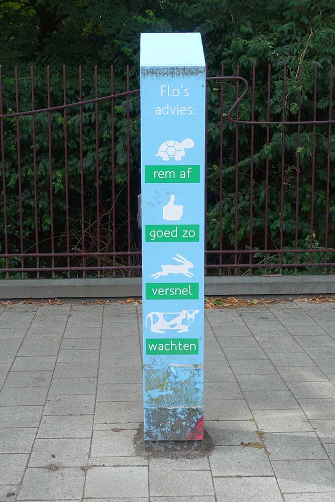 次の写真は、アムステルダム通りに設置されている「Flioライト」と呼ばれる装置です。横を走る自転車の速度を計測し、どのくらいの速度で走れば次の信号に青のタイミングで到着できるかを表示します。うさぎはスピードアップ、「いいね」マークはそのままのペース、カメはゆっくり、ウシは今回は青信号に間に合わないかもしれない、という意味だそうです。