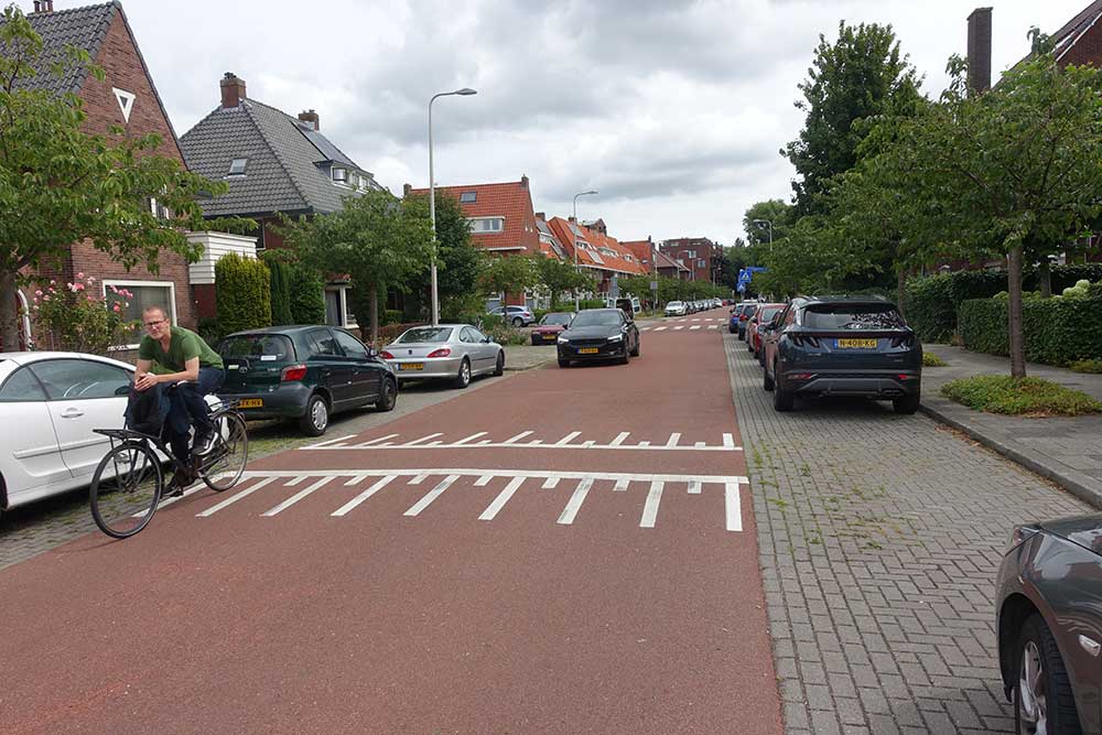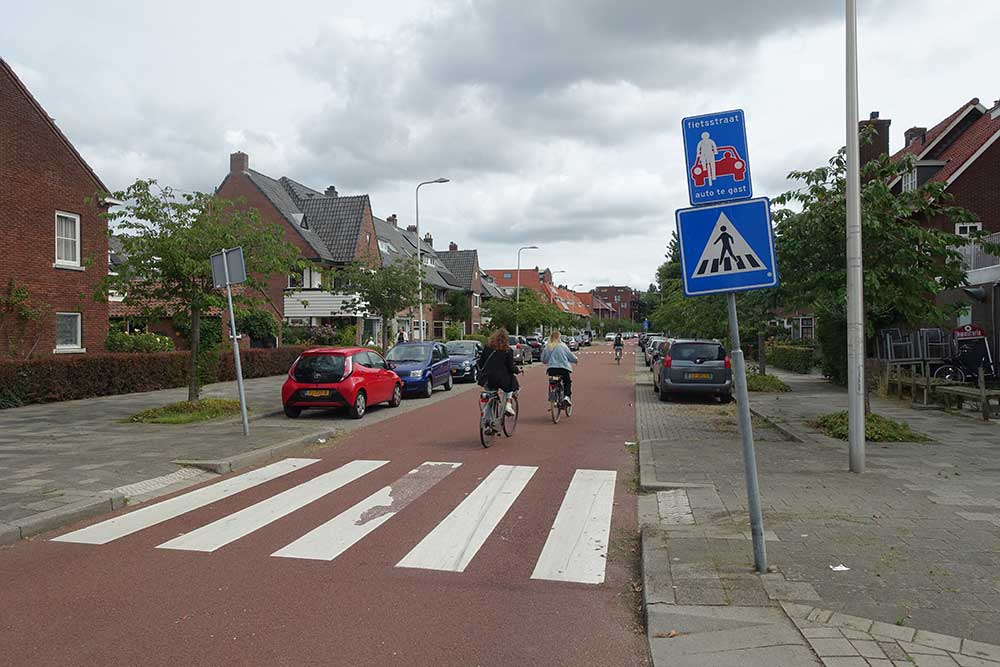次の写真は「自転車通り」と呼ばれる道路で、標識には「クルマはゲスト」と書かれています。制限速度は時速30kmで、自転車が優先されます。クルマは自転車を追い越すことができますが、安全が確保できる場合に限られています。