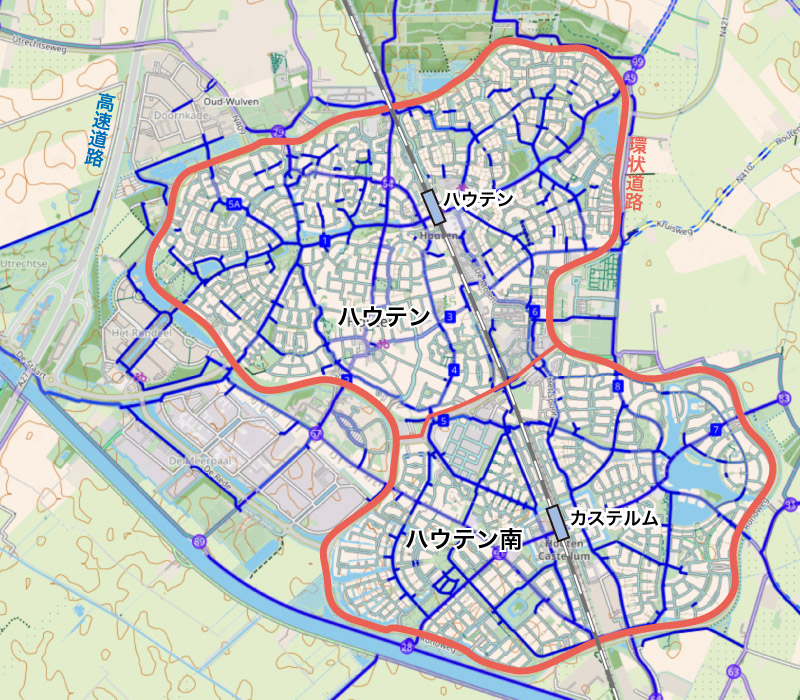 ハウテンは、ユトレヒト中心部から約8kmの場所にある、自転車を交通の中心に据えて計画的につくられたニュータウンです。1970年代から80年代にかけて本格的に整備され、さらに1990年代から2010年代にかけてハウテン南の拡張が行われました。現在の人口は約5万人です。