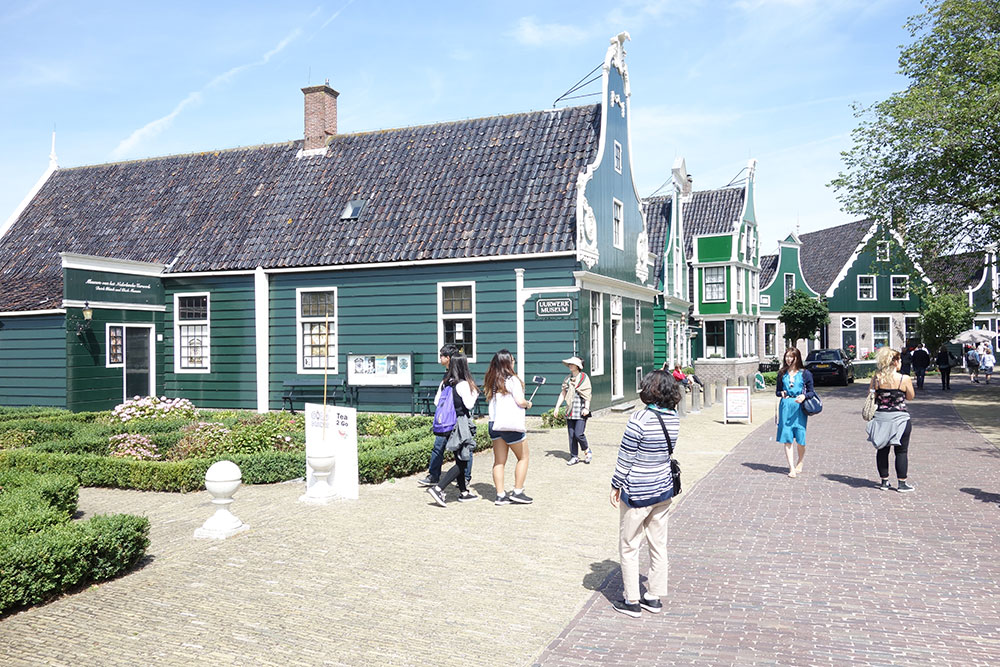オランダの建物は赤レンガ造りのものが多いのですが、ここの建物は木造で、壁が緑色に塗られているのが特徴です。