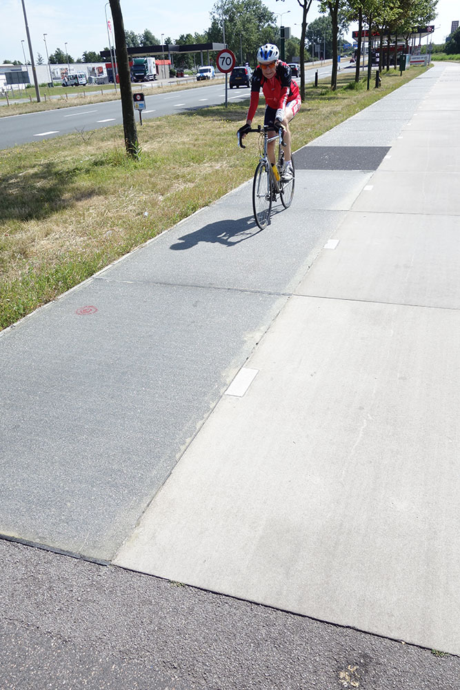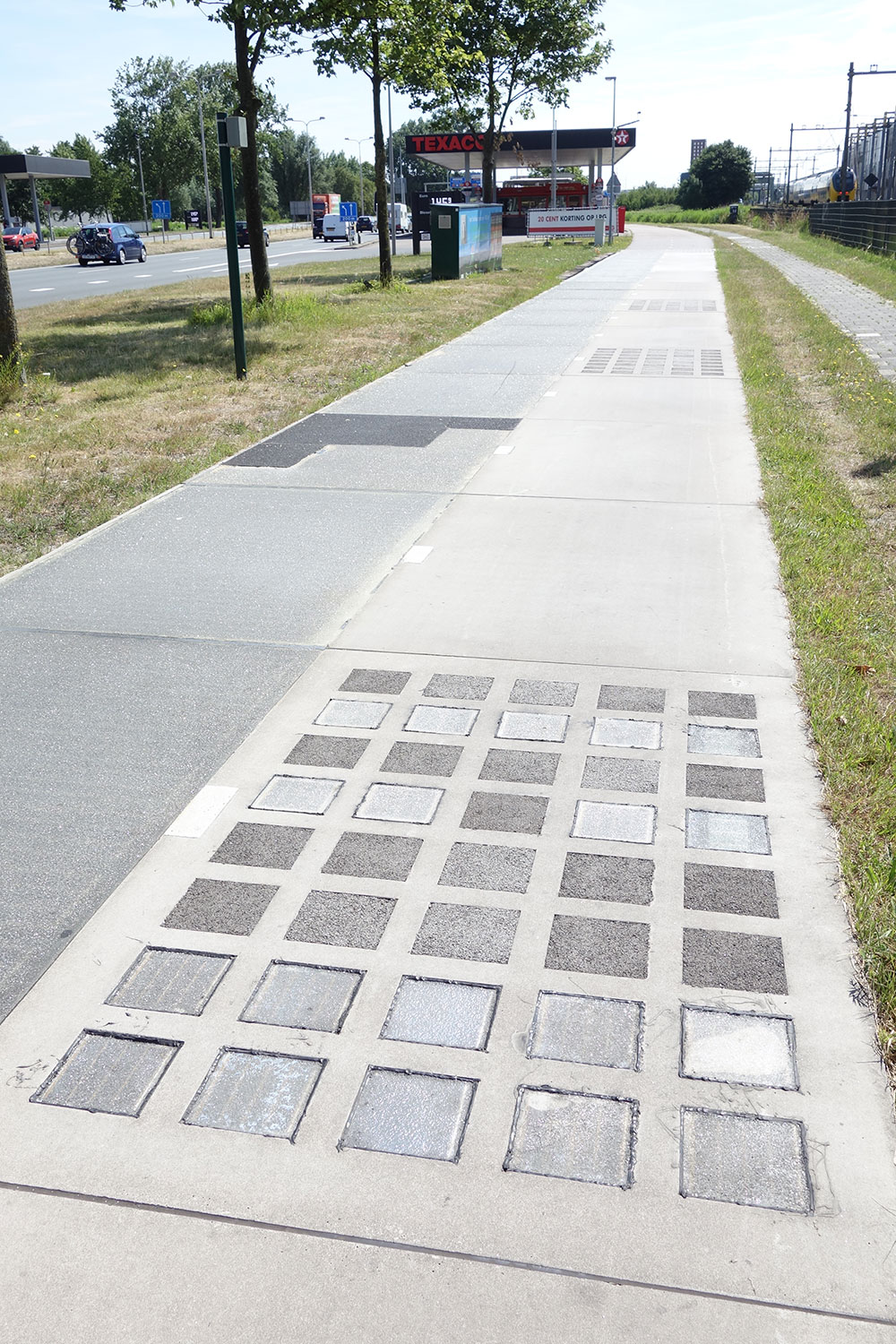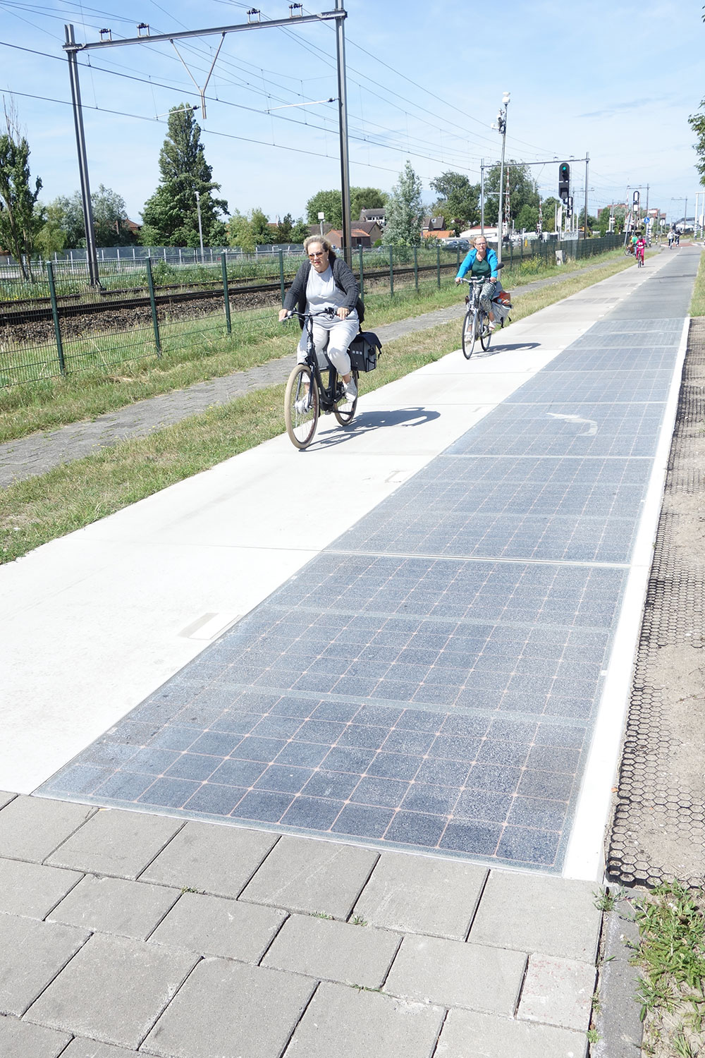 自転車道にはソーラーパネルが敷き詰められ、その上に強化ガラスが貼られています。さらに、滑りにくいよう表面に凹凸加工が施されています。