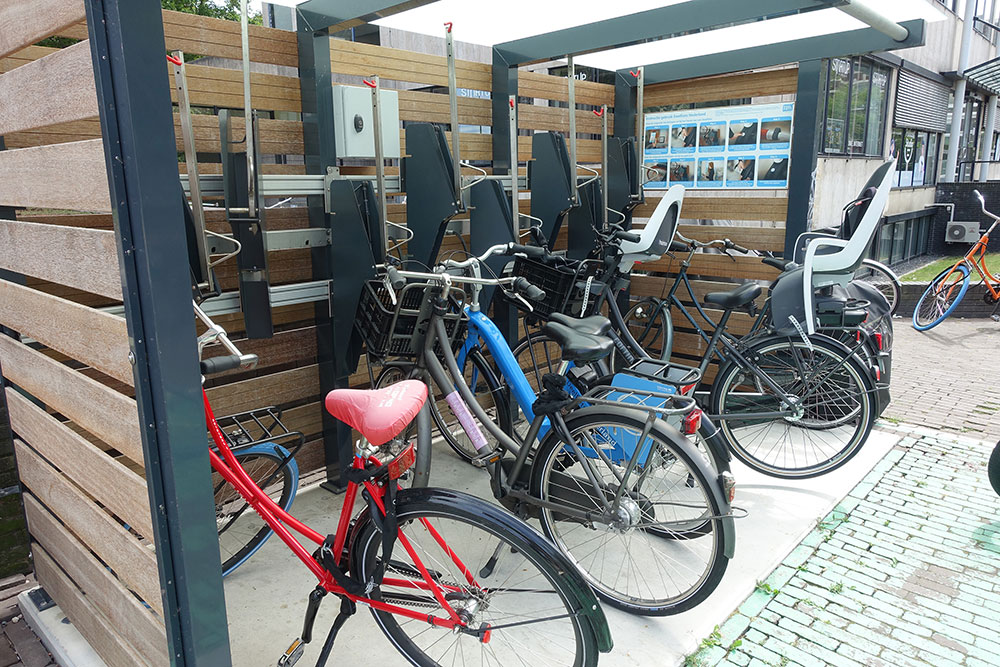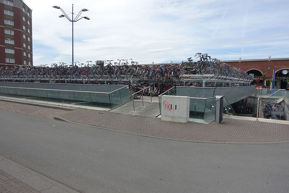 駅の駐輪場です。日本の駐輪場と同様、二段式ラックが並んでいます。