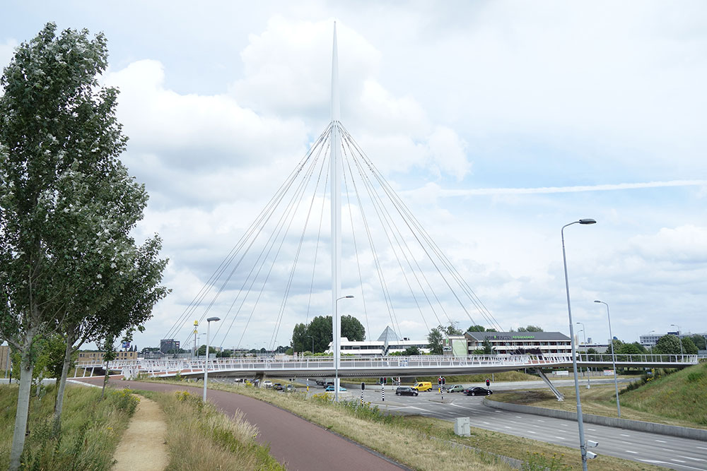 次に訪れたのは「ホーフェンリング」です。車のラウンドアバウト(円形交差点)の中心に高さ約70メートルの塔が立ち、そこからリング状の自転車専用ラウンドアバウト橋が吊り下げられています。