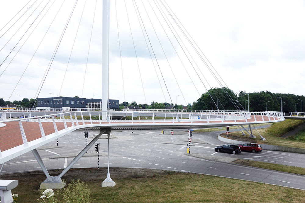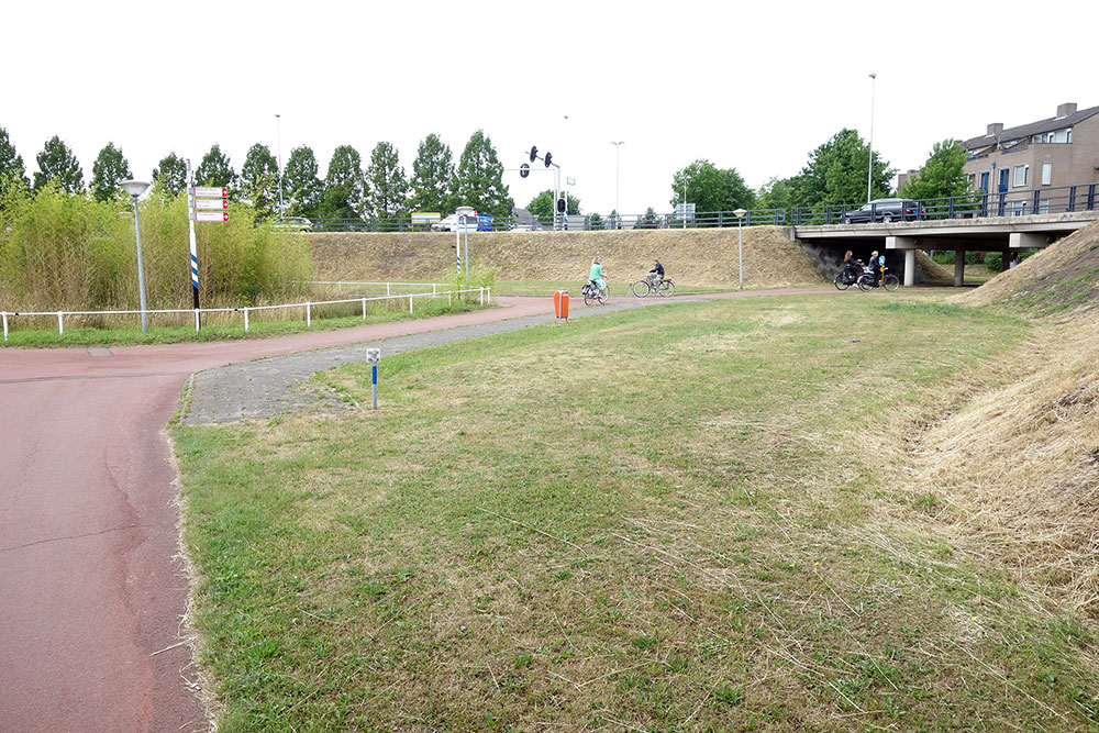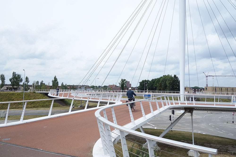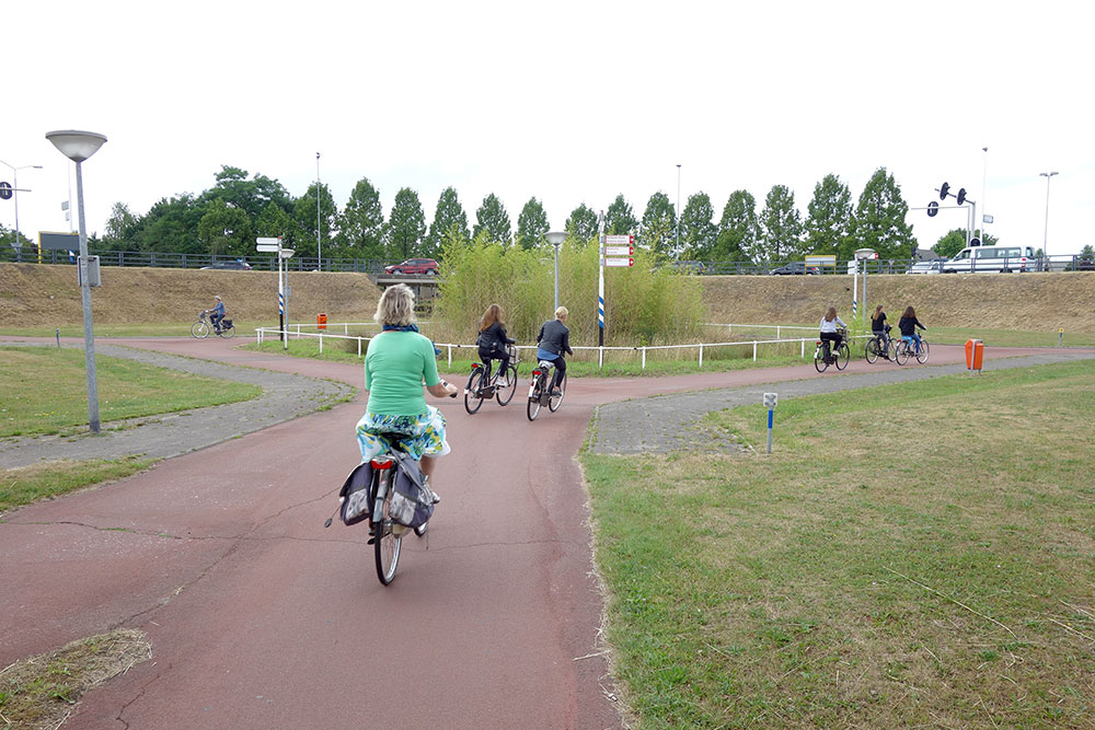 幹線道路の両側を走る自転車道は、ラウンドアバウトに向かって非常にゆるやかな坂を上り、車とは完全に分離された橋を通って、安全に、信号に左右されることなく、どの方向へも進むことができます。