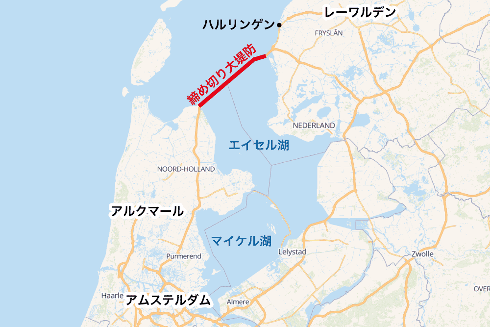 オランダ北部には、海をせき止めて洪水を防ぐために造られた「締め切り大堤防」と呼ばれる、全長約32kmにおよぶ巨大な堤防があります。北海からの入り江をせき止めて淡水湖にすることで、洪水から国土を守るとともに、新しい土地をつくるための大規模な事業によって建設されたものです。