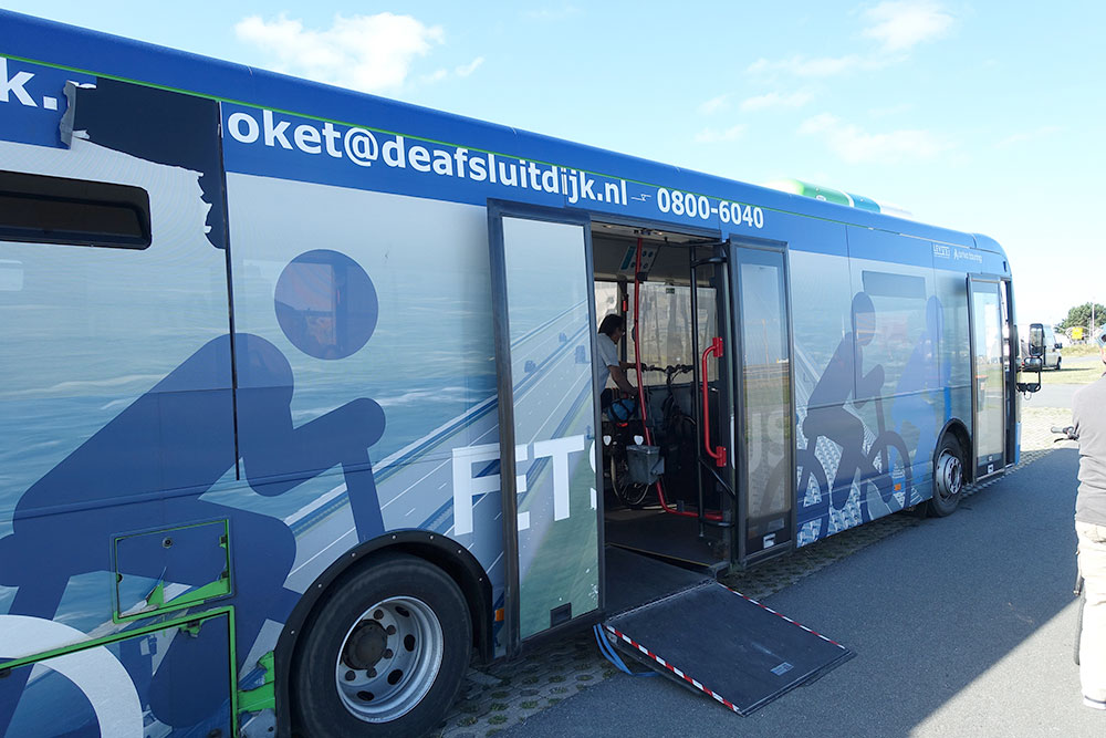 FIETSBUSは、自転車のための代替手段として用意されたもので、自転車を堤防の反対側まで運ぶためのバスでした。通行止めの場合でも、自転車のためにしっかり代替手段を用意するのが、いかにもオランダらしいところです。