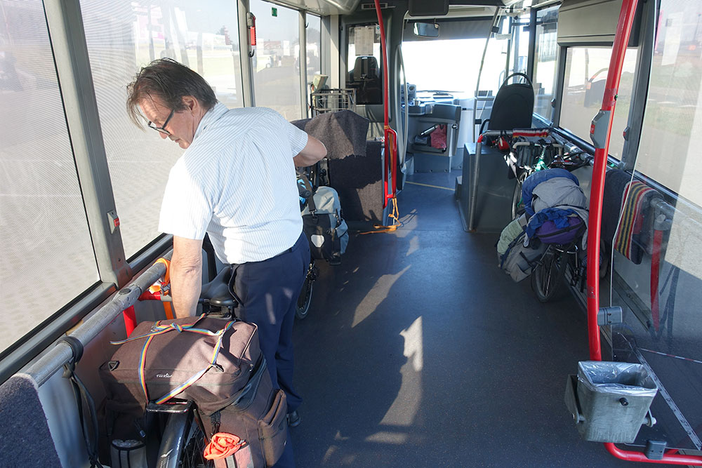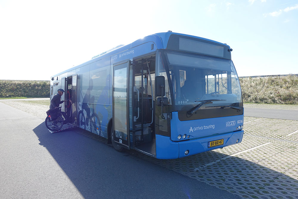 さて、いよいよ堤防に入るというところの駐車場に、「FIETSBUS(FIETSはオランダ語で自転車の意味)」と書かれたバスが停まっていました。