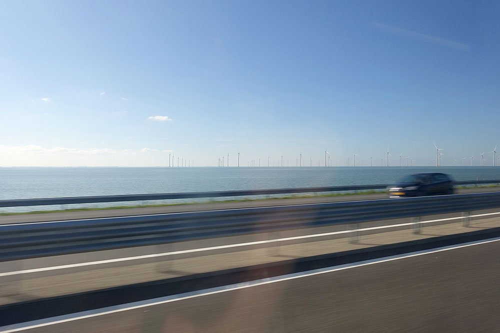 締め切り大堤防の東端近くの町、ハルリンゲンから堤防に向かって走っていきます。周囲には風力発電の風車がたくさん並んでいました。